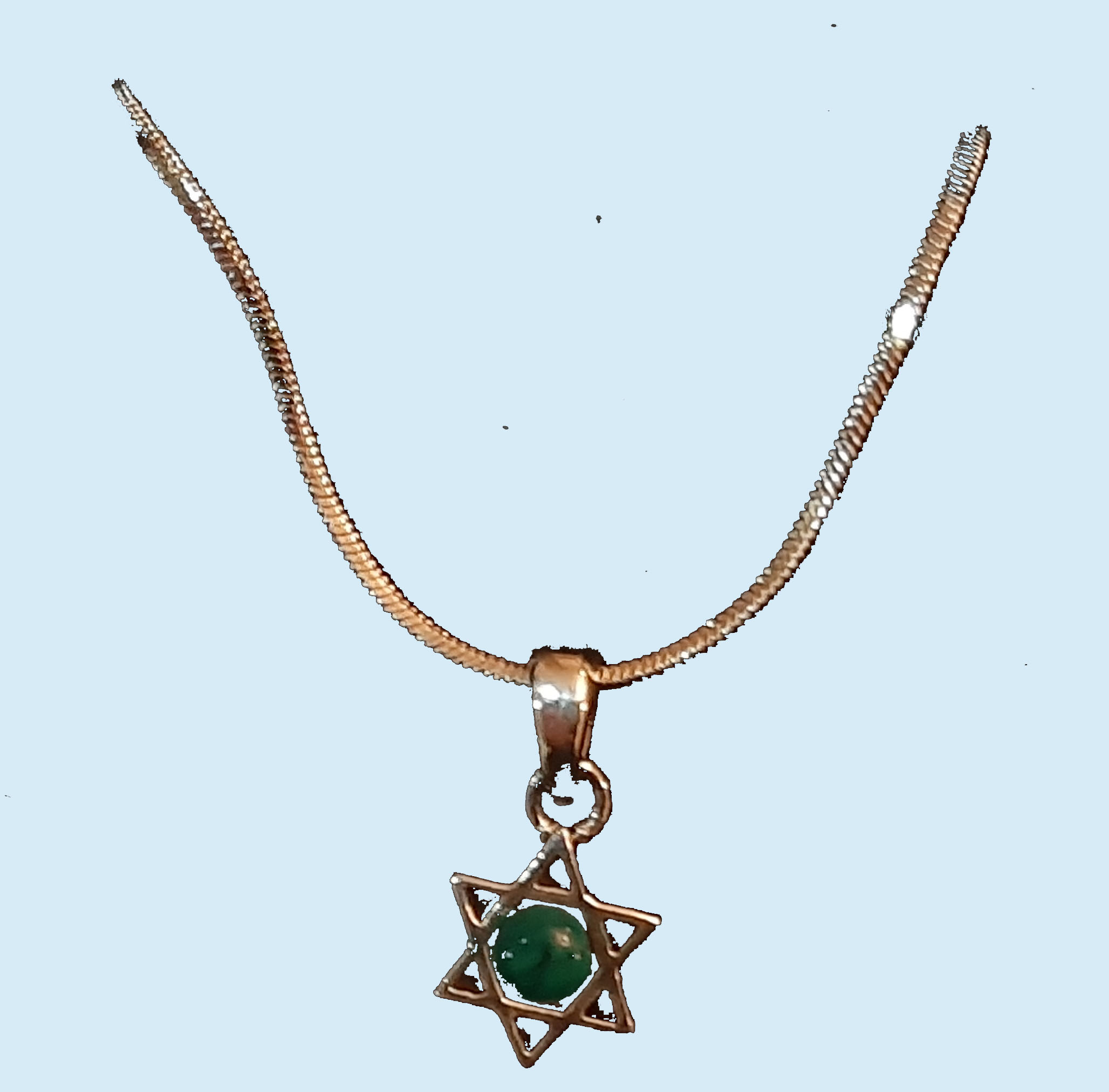 Handcrafted Star of David pendant with Eilat stone. In Hebrew, the “Magen David” means the “Shield of David,” symbolizing the relationship between man and God, where God serves as man’s shield and protector.
